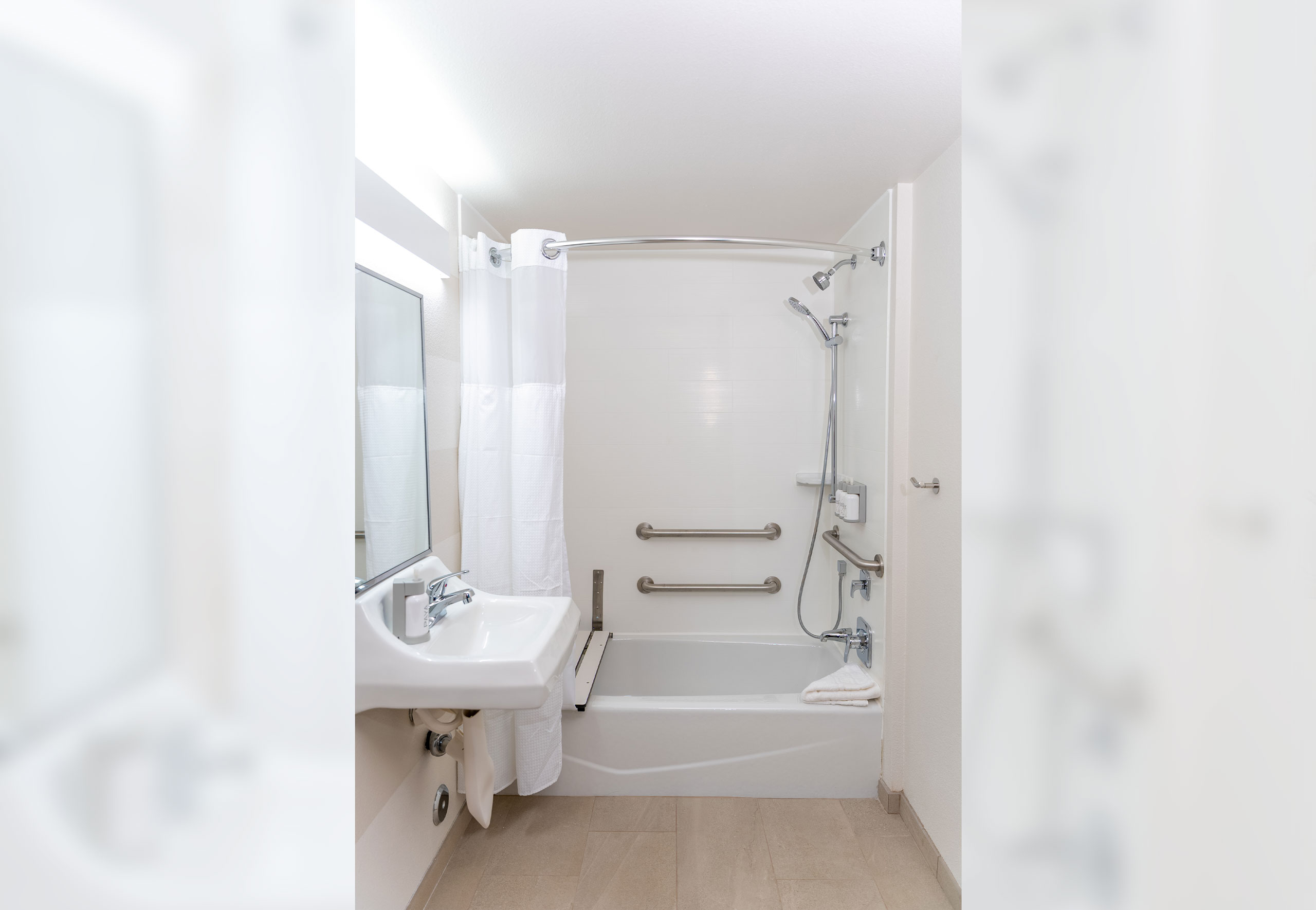 Enjoy comfort and accessibility in our accessible queen room, designed with your needs in mind. This wheelchair-accessible room features a spacious bathroom with a roll-in tub, grab bars and a handheld shower head. It also includes a flat-screen TV with closed captions, a mini fridge, a microwave and all the toiletry essentials for a convenient stay.